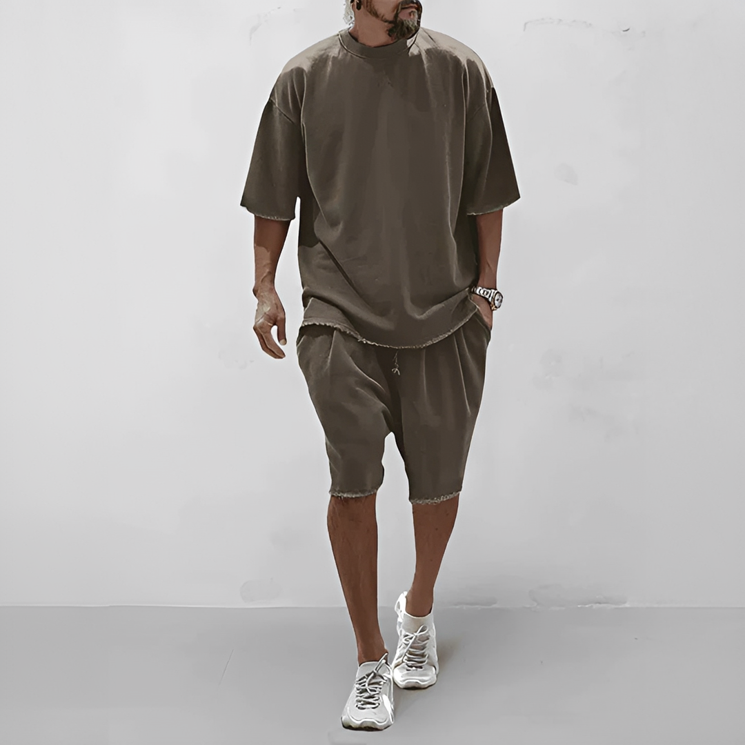 Este conjunto de verano para hombre Roldan incluye una camiseta ligera y un pantalón corto a juego, diseñados para ofrecer la máxima comodidad y un estilo informal. Fabricado en un tejido transpirable y suave, te mantiene fresco durante los días calurosos mientras ofrece un corte relajado. Perfecto para salidas a la playa, actividades al aire libre o para relajarse en casa, combina practicidad y un look moderno. Su diseño coordinado garantiza una apariencia elegante y sin esfuerzo, sin comprometer la comodidad. Mejora tu guardarropa veraniego con un conjunto versátil y fácil de llevar.