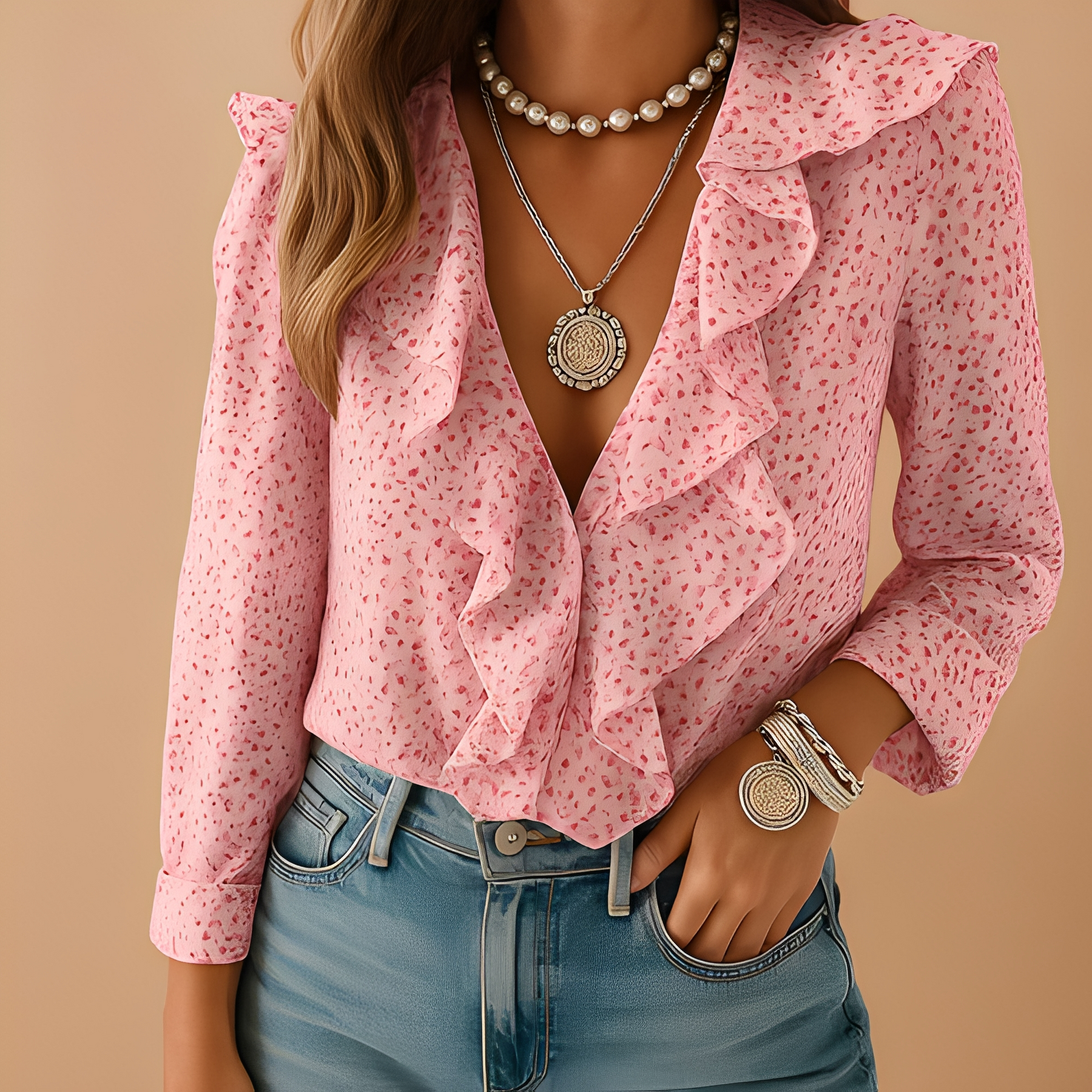 Una blusa con volantes imprescindible que combina elegancia, confort y estilo atemporal.
