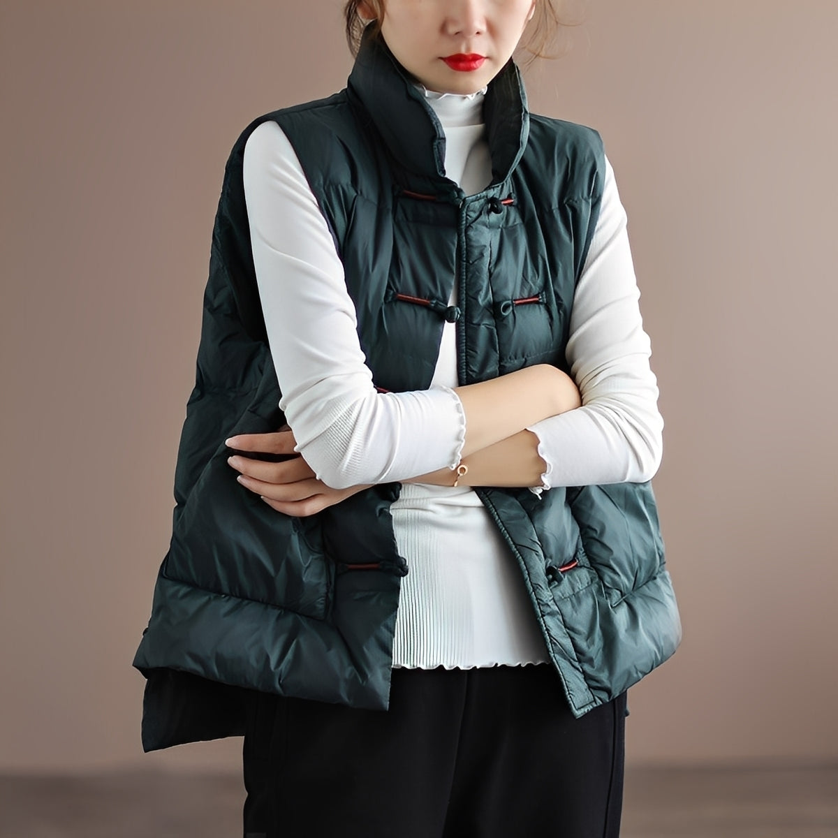 El chaleco de plumas "Alicia" combina el estilo étnico tradicional con la aptitud moderna para el invierno. El cuello alto protege agradablemente del frío y subraya el diseño elegante. Los bolsillos prácticos ofrecen espacio para pequeños objetos cotidianos. La forma sin mangas lo hace ideal para superponer sobre suéteres o camisetas de manga larga. Perfecto para looks con estilo en la temporada fría.