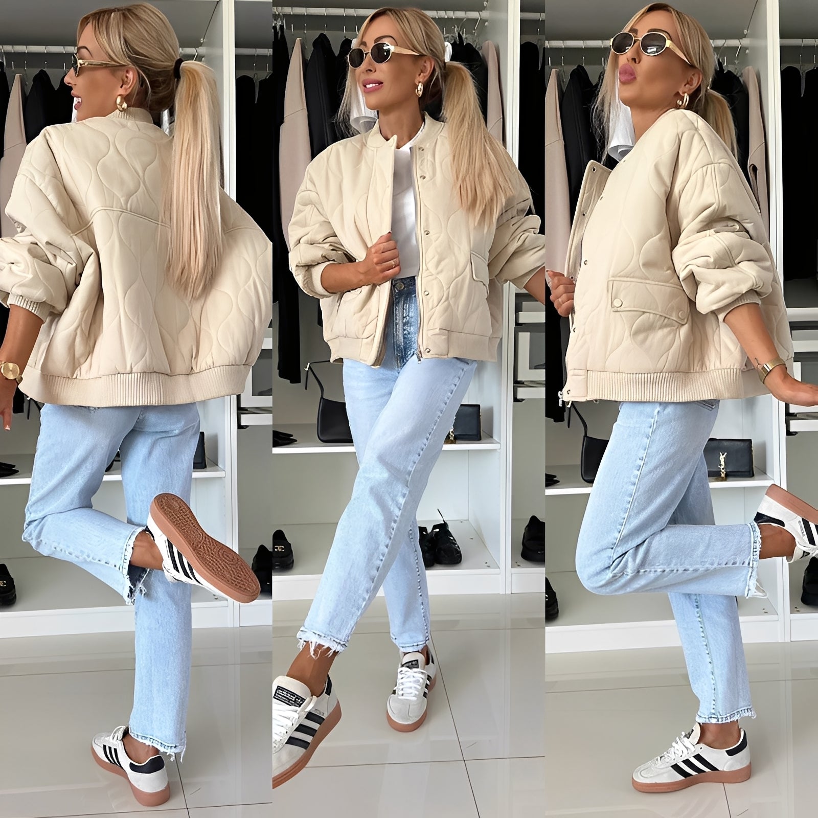 La chaqueta bomber "Carmen" combina la estética atemporal del streetwear con detalles modernos. Gracias a su corte holgado y materiales suaves, ofrece un confort óptimo, ideal para la temporada de transición o noches frescas de verano. Los bolsillos laterales proporcionan espacio de almacenamiento práctico, mientras que los puños elásticos de canalé en las mangas y el dobladillo aseguran un ajuste perfecto. Ya sea casual o deportiva, esta chaqueta se adapta a tu look.