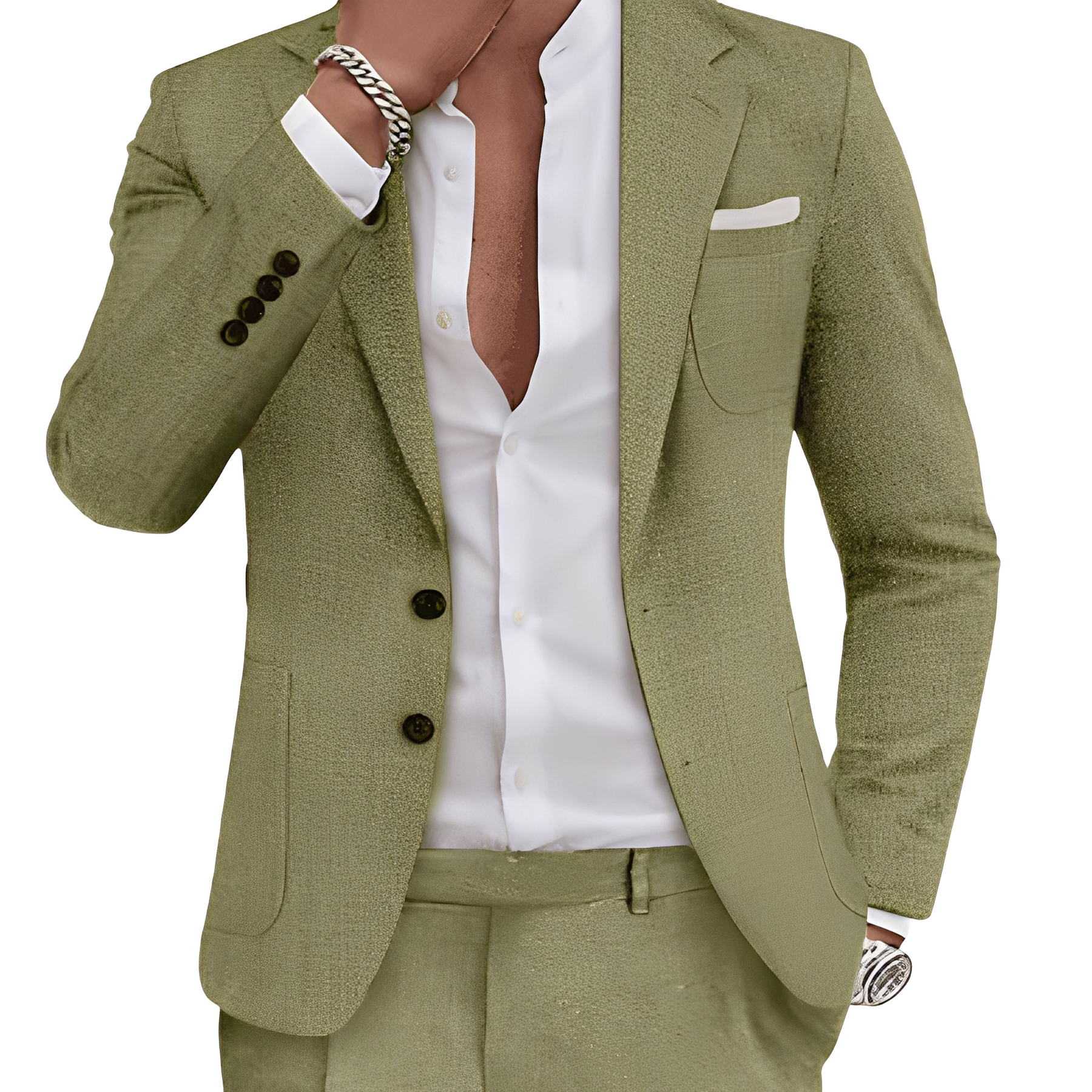 El traje Clinton combina un estilo clásico con una modernidad desenfadada. Fabricado con una mezcla de lino ligero, proporciona una sensación de comodidad al usarlo, perfecto para días cálidos o ocasiones especiales. Su diseño elegante con bolsillos prácticos lo convierte en un verdadero atractivo tanto en la oficina como en el tiempo libre.